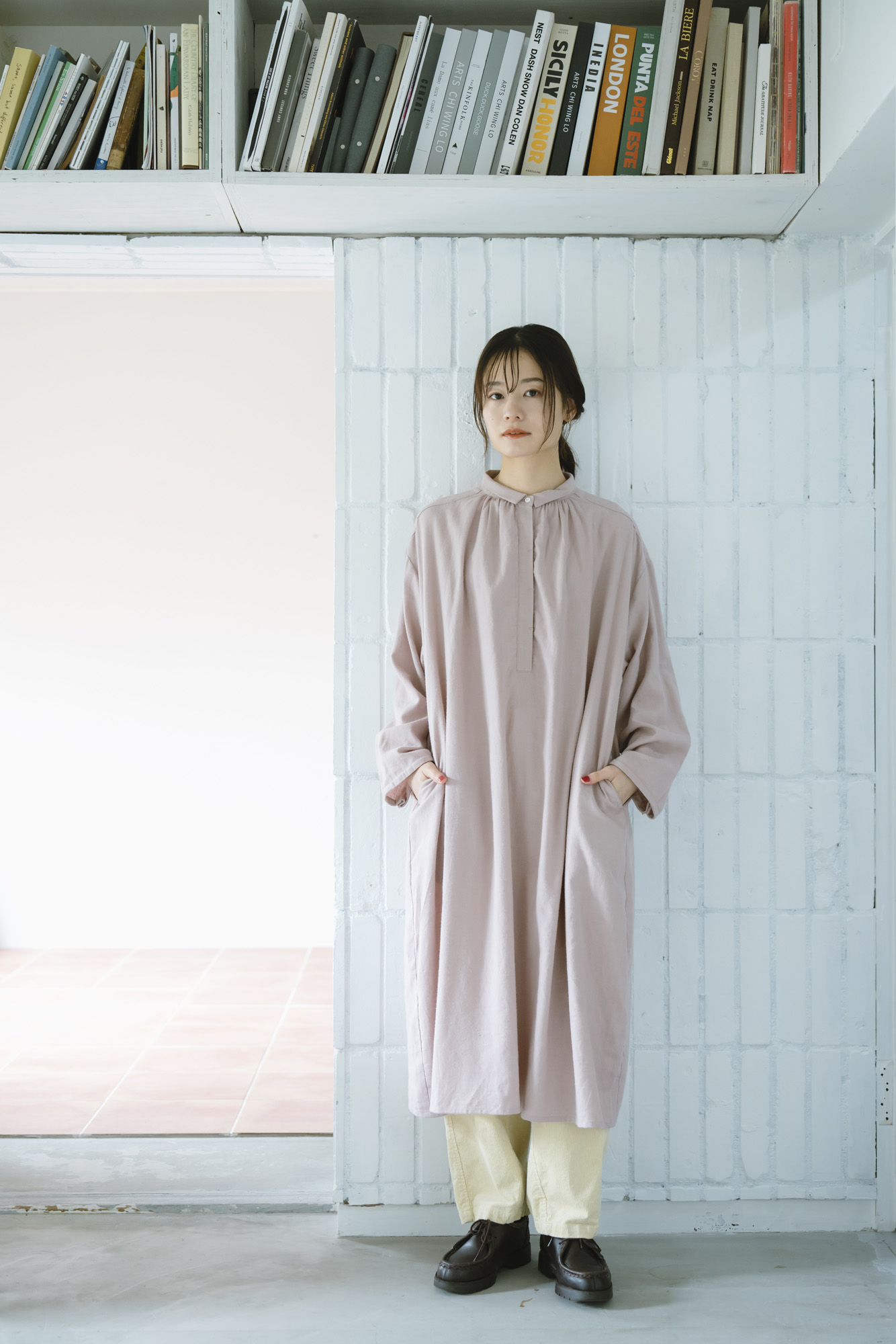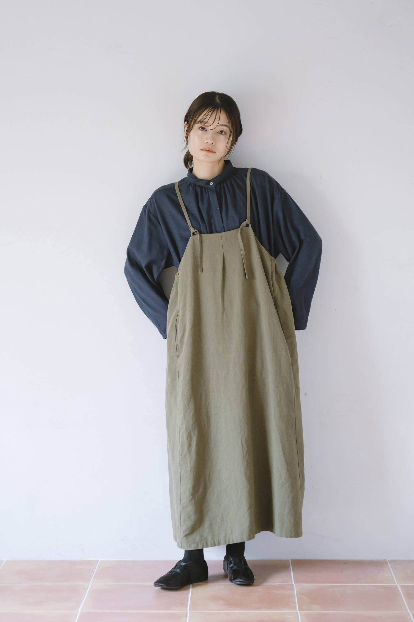 オリジナルツイルちび衿ギャザーワンピース ¥15400 ハイネックニットプルオーバー ¥15400 三つ杢ツイルストレートパンツ ¥18700