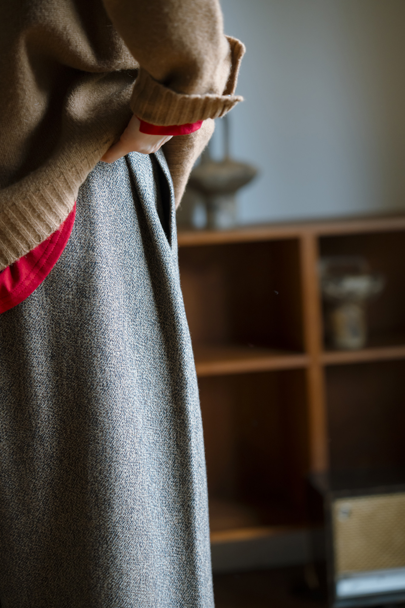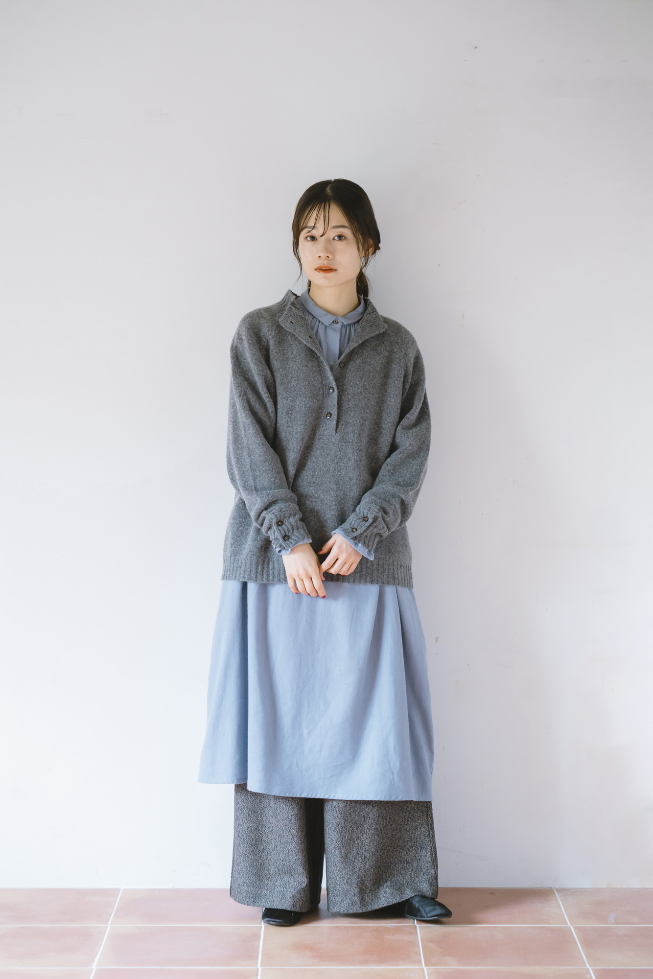 布帛コンビレイヤードカットソー ¥9900 ラクーンブレンドニットプルオーバー ¥17600 ポリウールセミタイトタックSK ¥15400