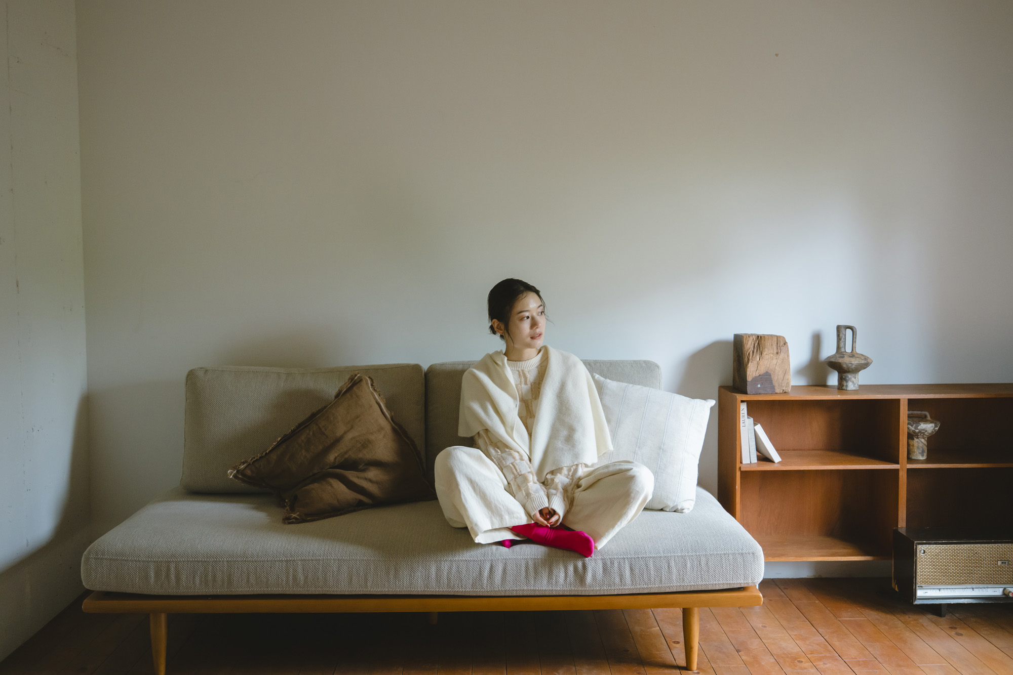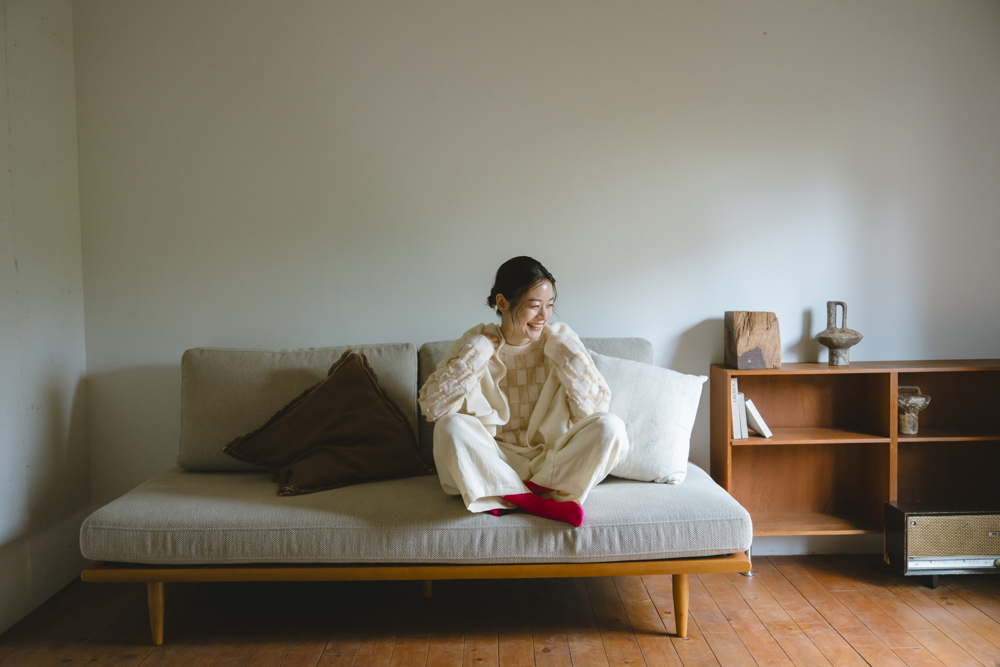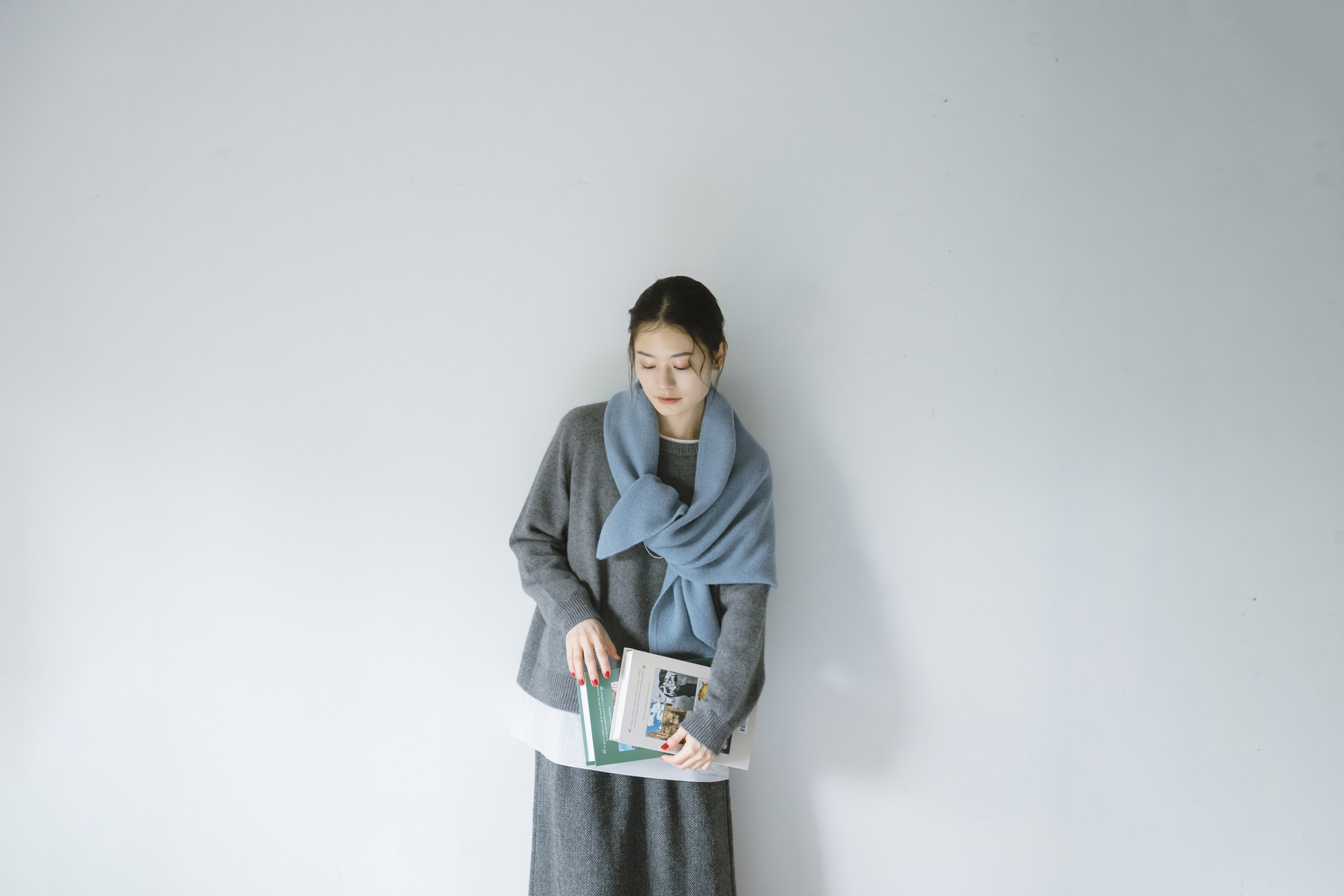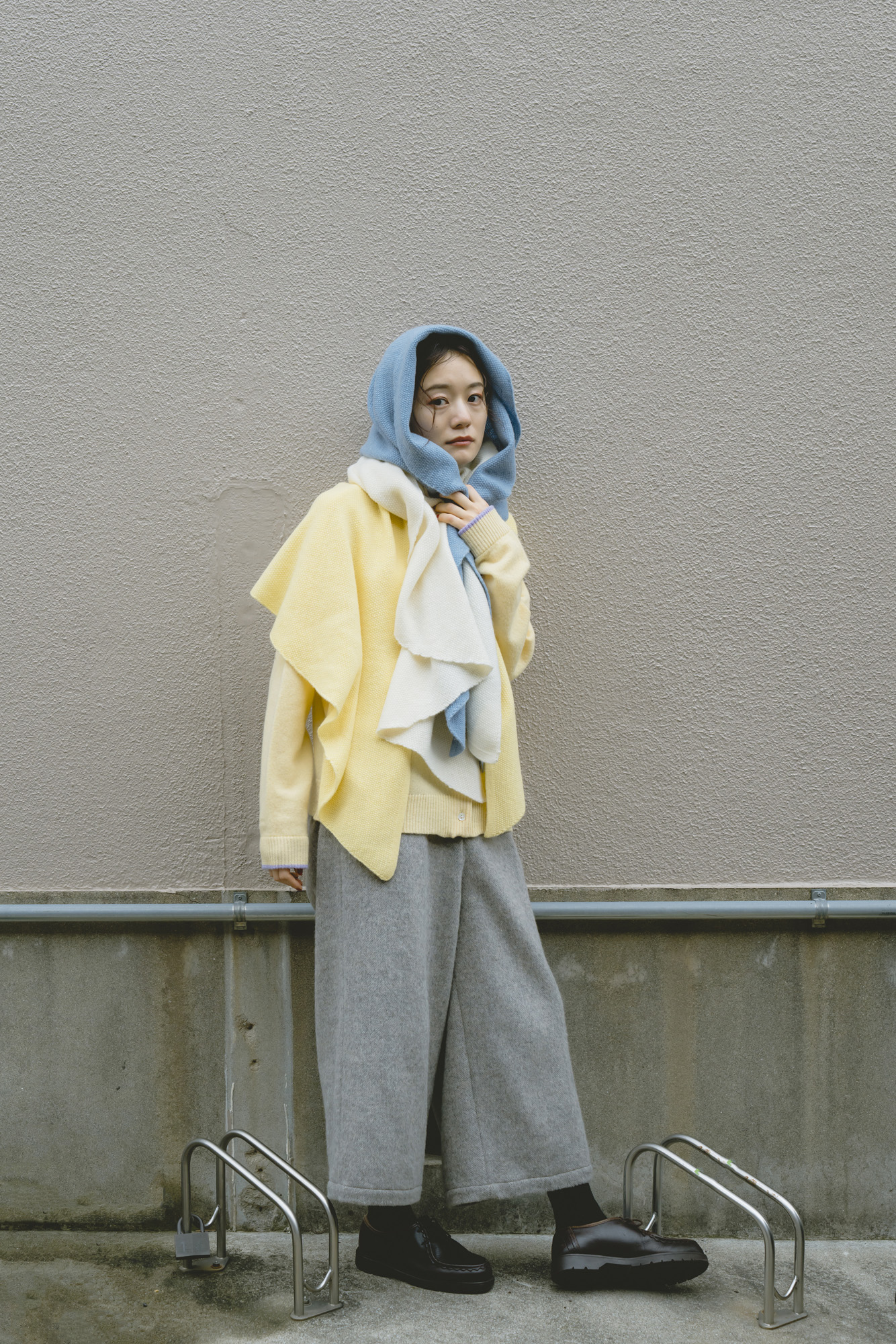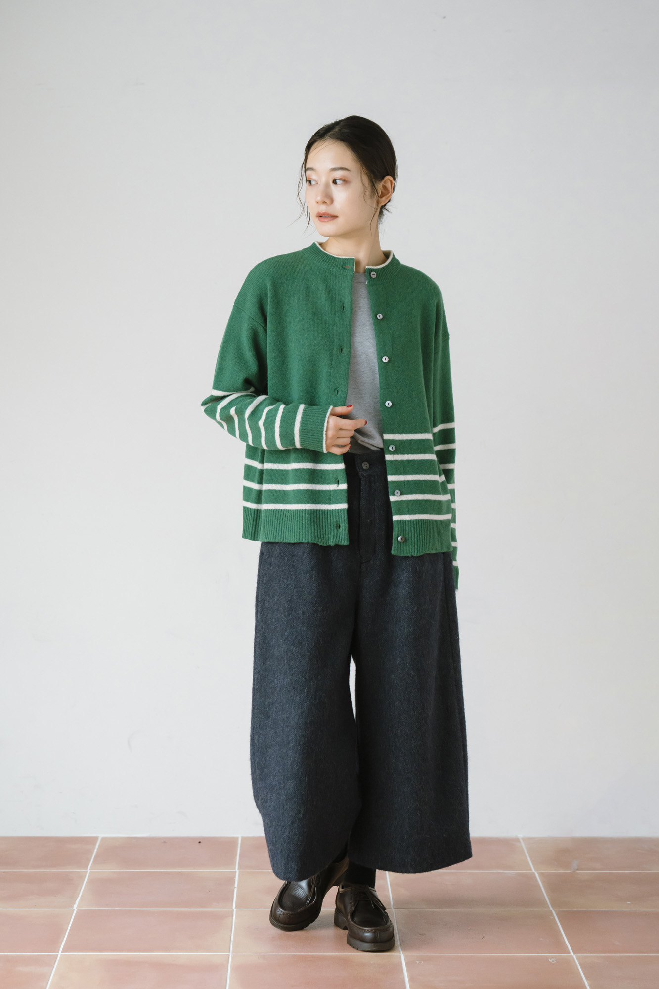 鹿の子ニットストール ¥7150 ラムウール配色ニットカーディガン ¥13200 エコウール裏付き9分丈パンツ ¥22000
