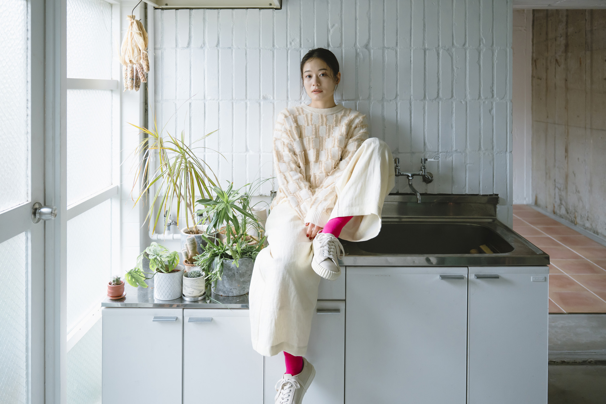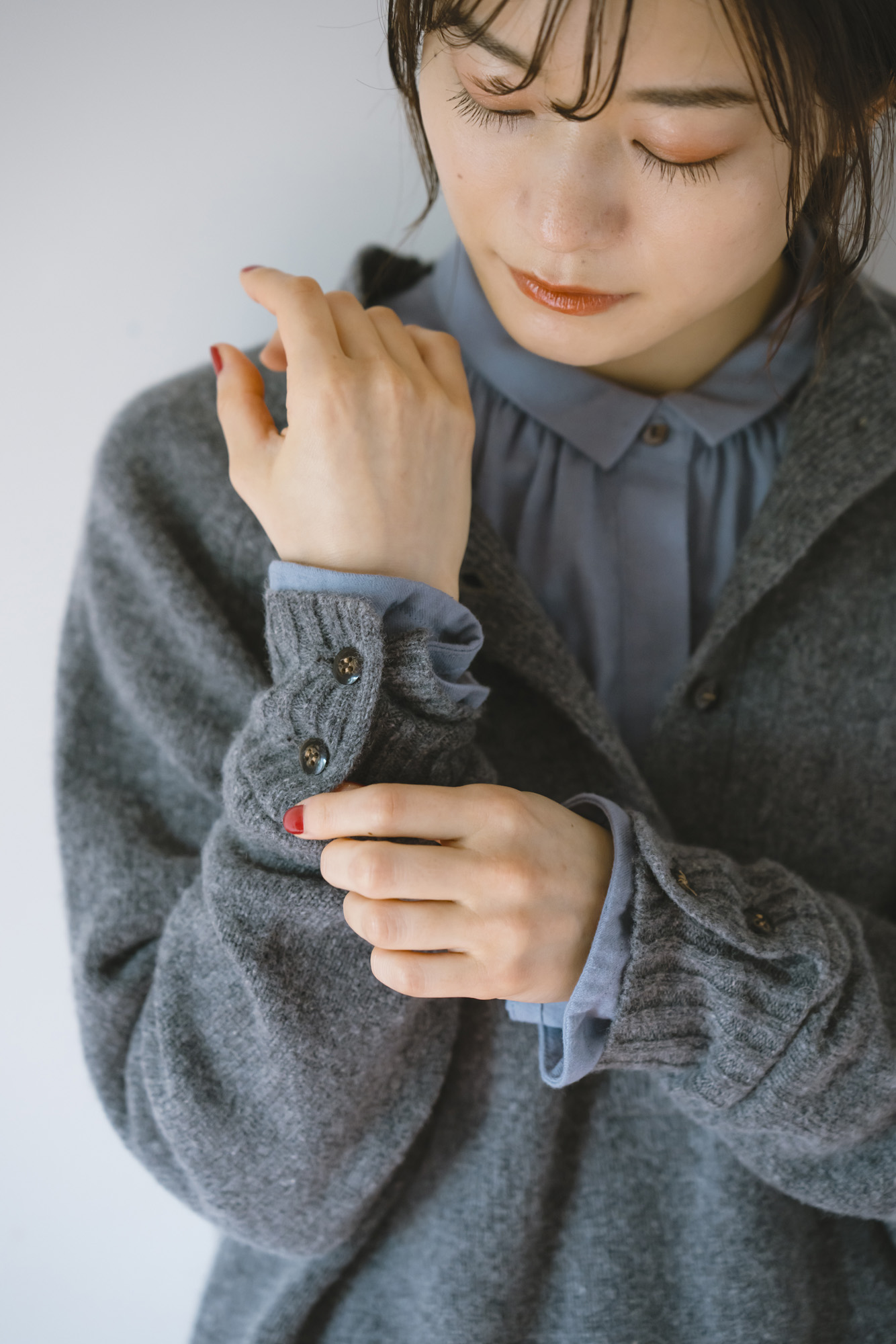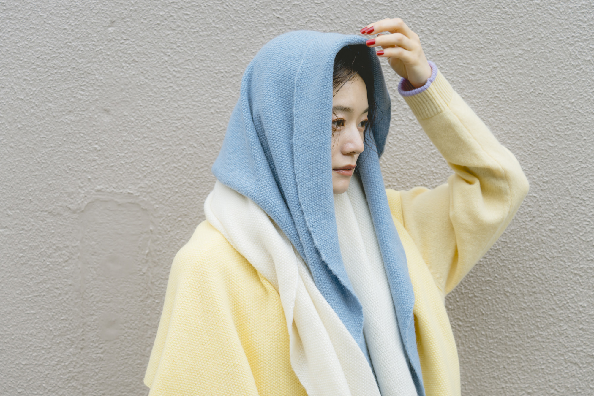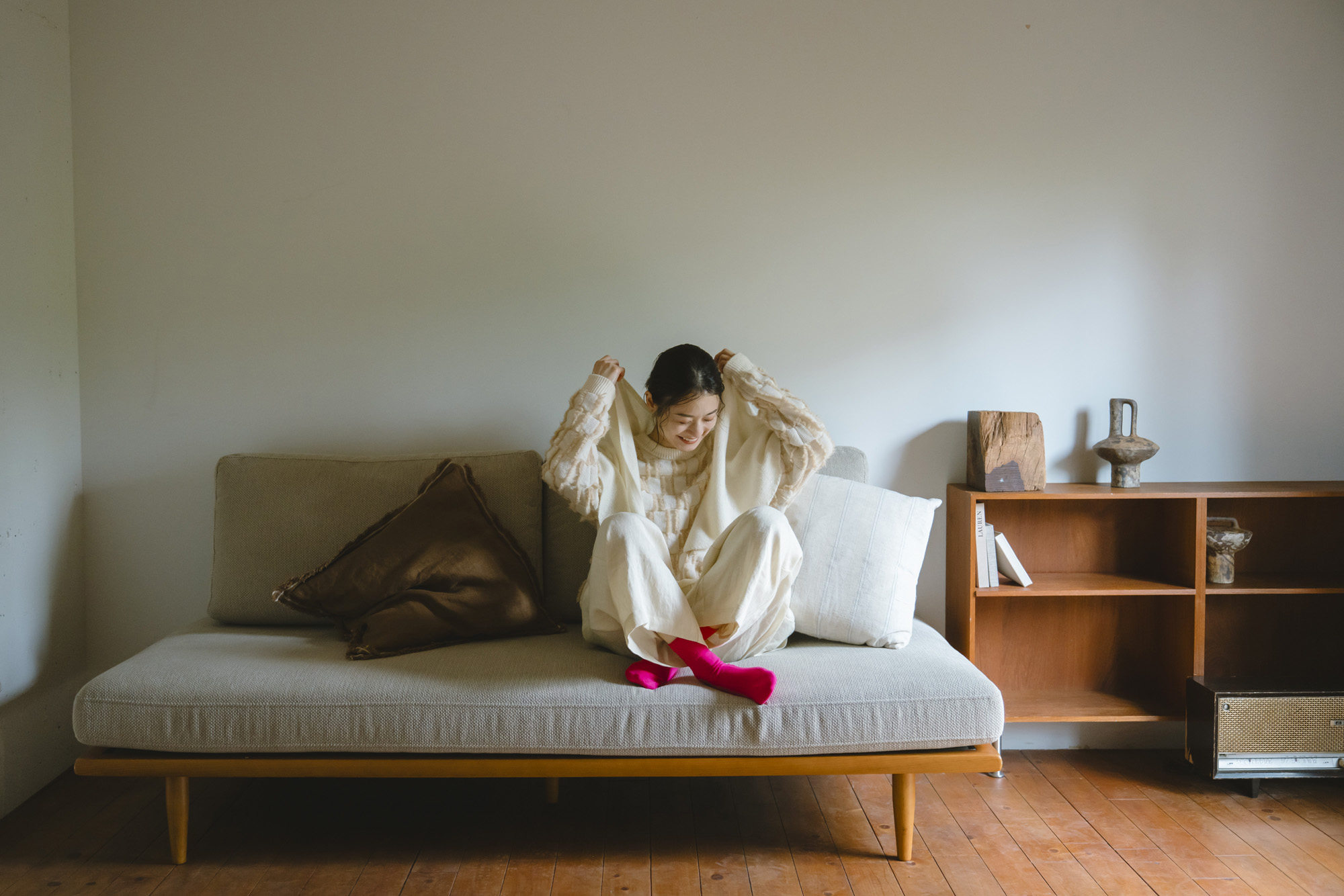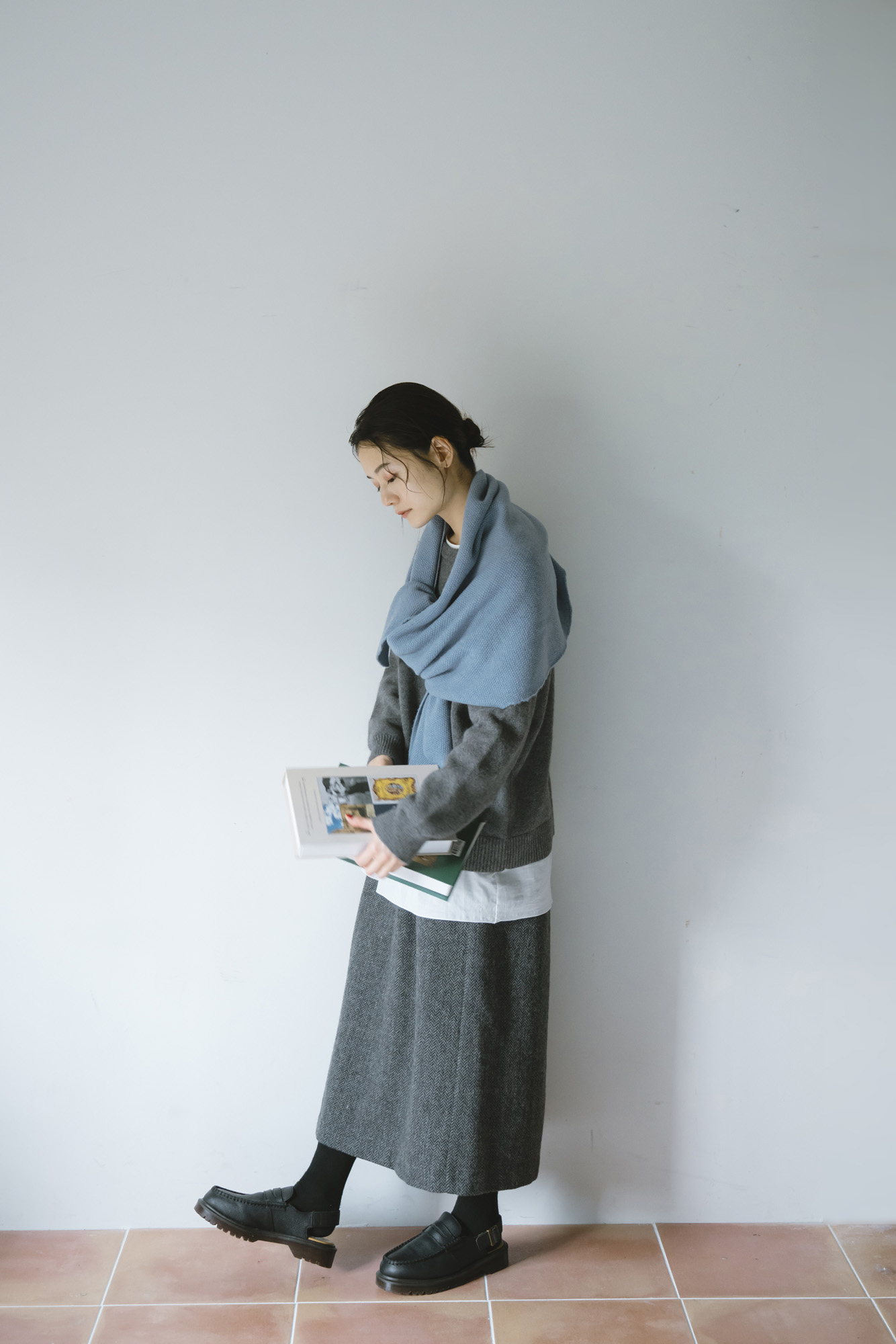 鹿の子ニットストール ¥7150 ラムウール配色ニットカーディガン ¥13200 エコウール裏付き9分丈パンツ ¥22000