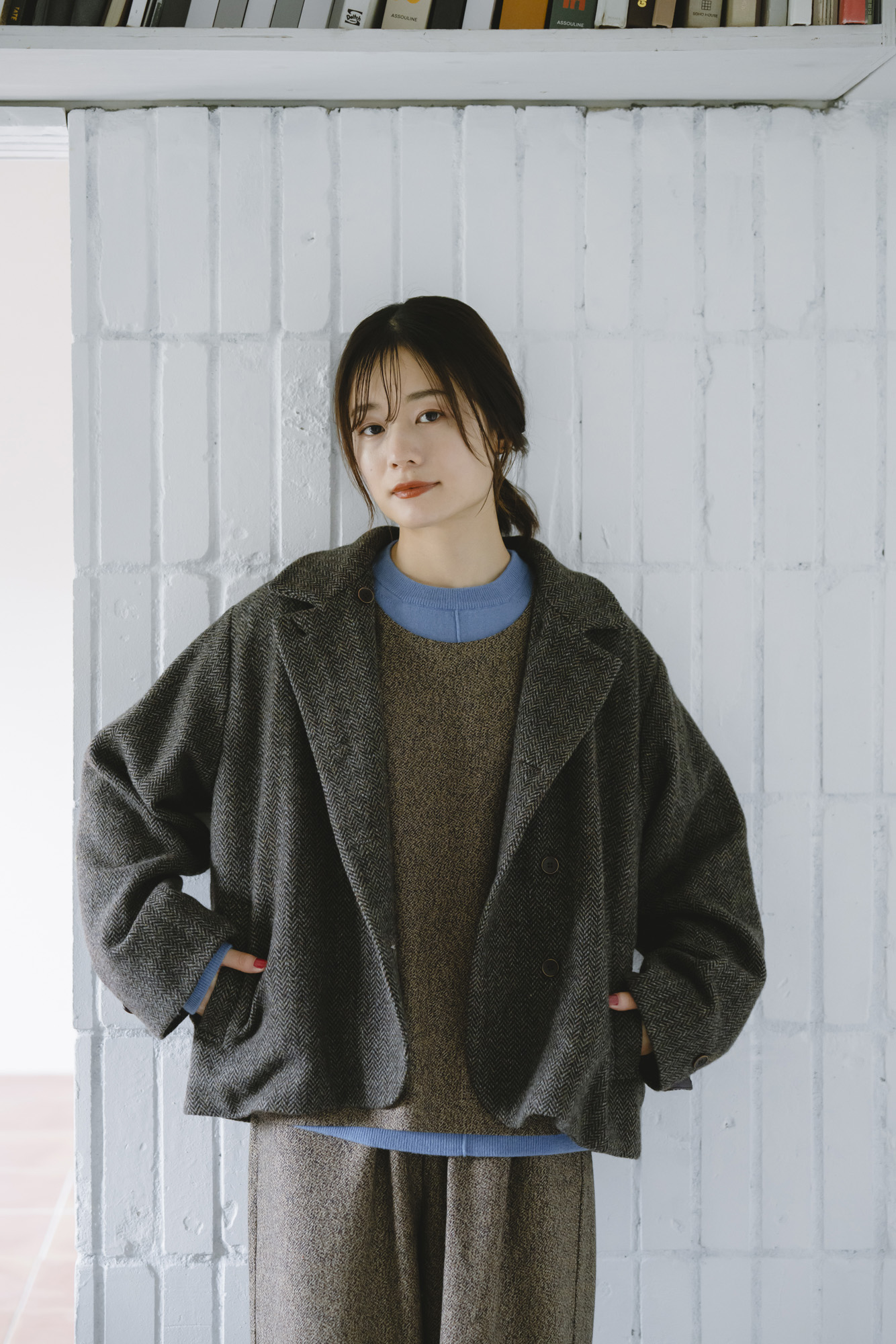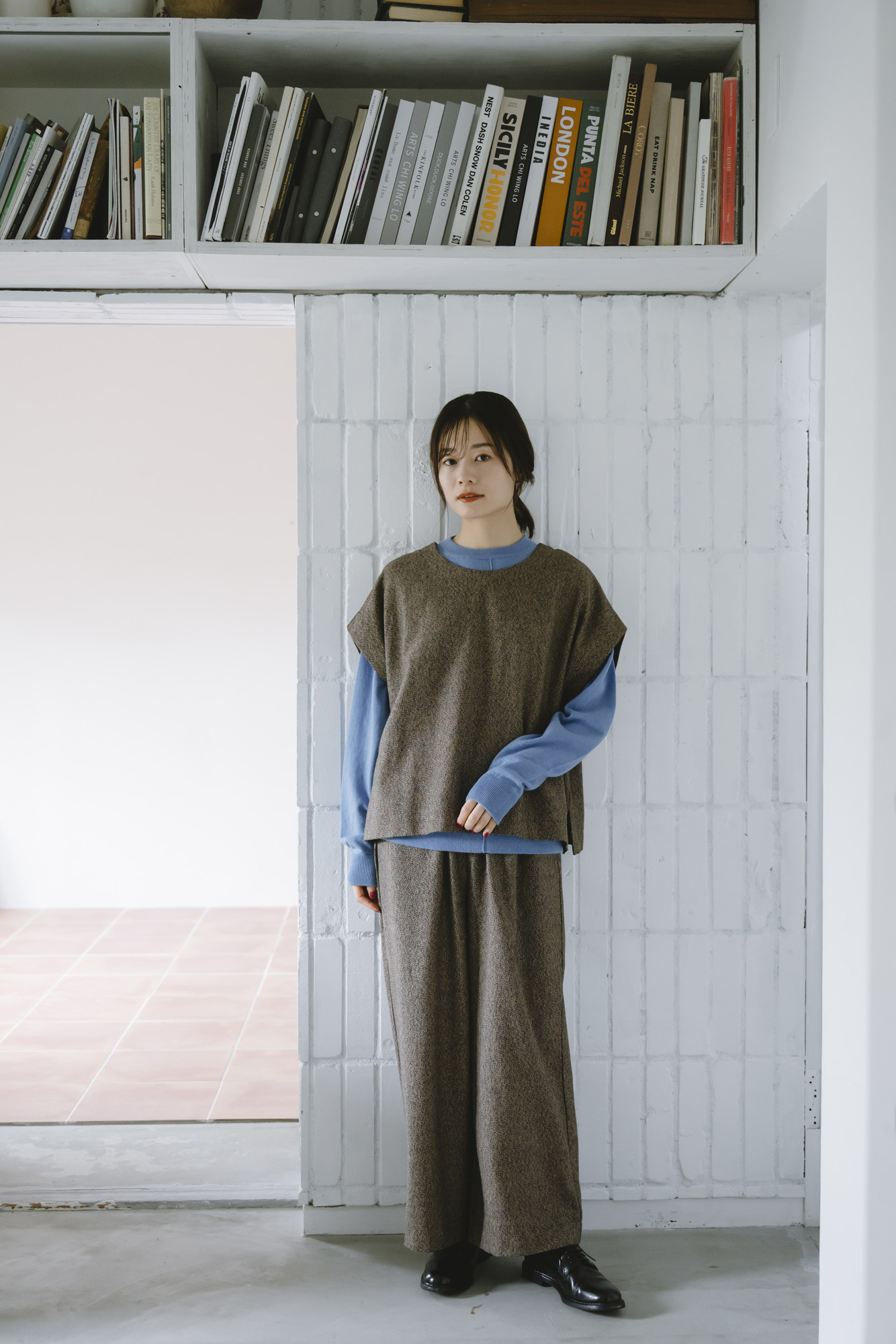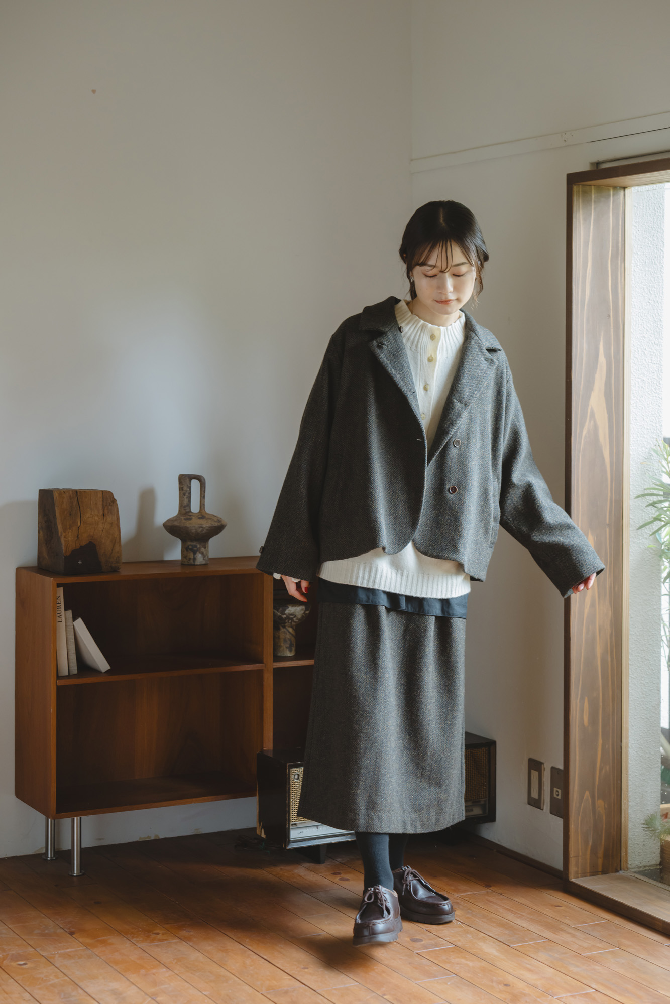 柔らかメリノアウトリンキングニット ¥12100 三つ杢ツイルワイドベスト ¥15400 三つ杢ツイルストレートパンツ ¥18700 ポリウールセミダブルジャケット ¥22000