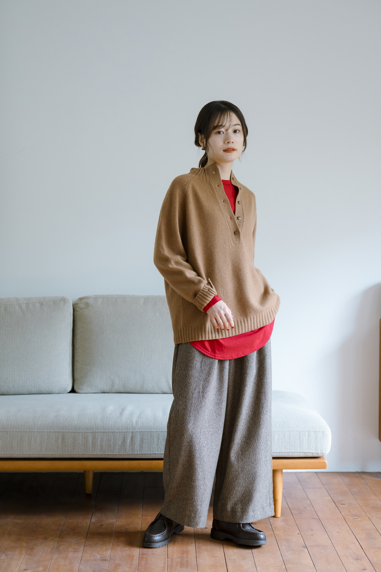 ナチュラルソフト天竺ロングカットソー ¥7700 柔らかメリノアウトリンキングニット ¥12100 12Wフロントダーツパンツ ¥15400