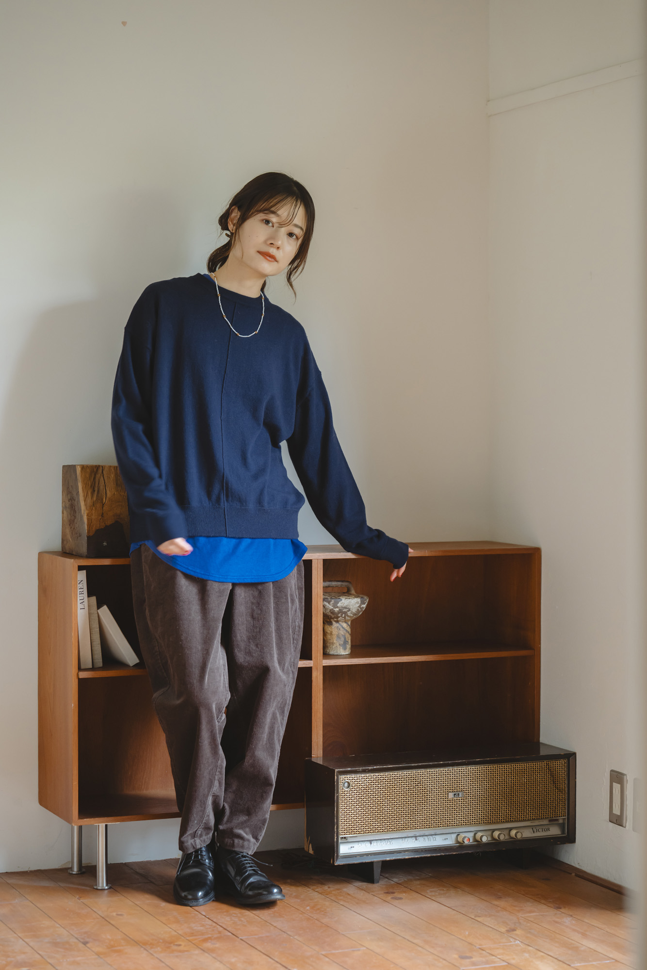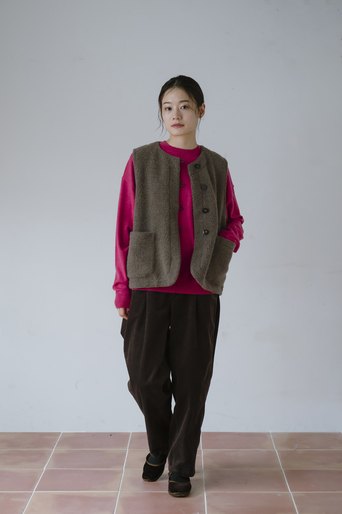 柔らかメリノアウトリンキングニット ¥12100 ウールリッチパイルループベスト ¥16500 12Wフロントダーツパンツ ¥15400