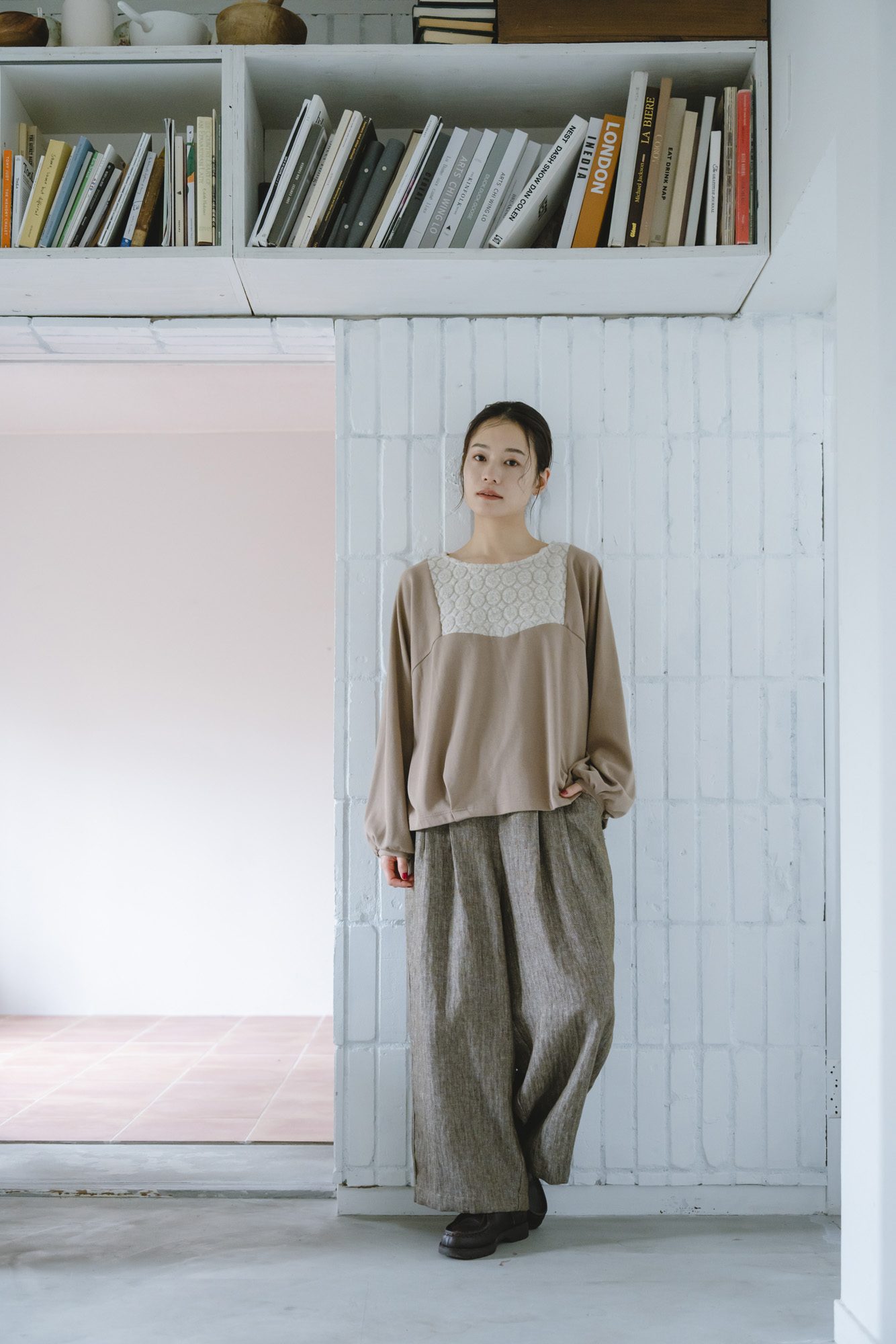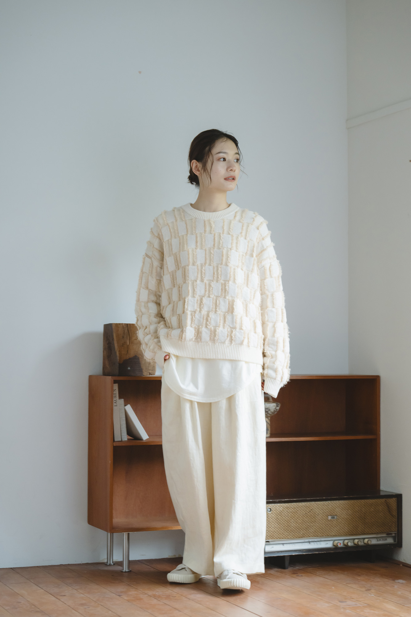 パイルジャガード×コットンスムースプルオーバー ¥13200 綿麻デザインタックパンツ ¥15400